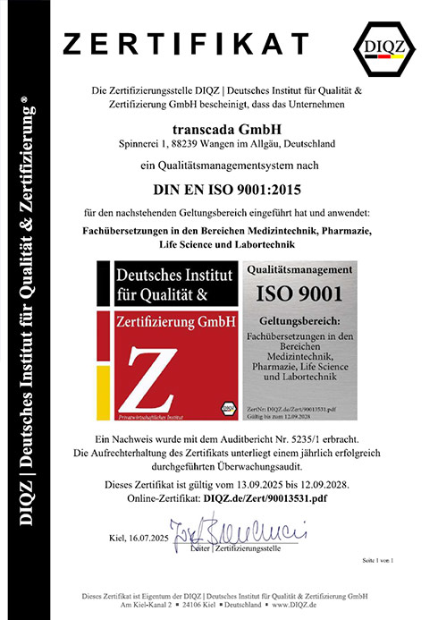 Basis ist die Implementierung eines Qualitätsmanagementsystems (QMS). Für transcada haben wir schon vor dem Bearbeiten des ersten Auftrags ein QM-System aufgesetzt.